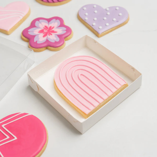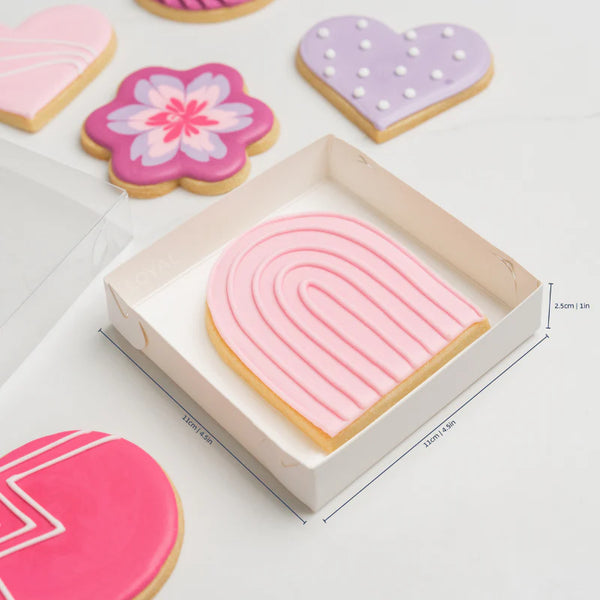 This cookie box will look stunning with a few designer handcrafted biscuits inside. These versatile boxes are also ideal for packaging several other products, from Corporate Event Gifts, to Grazing platters, to all of your e-commerce packaging needs. You can become creative and even add some shredded tissue paper to make your products really pop! Presented in a stunning gloss white finish, the boxes will remain clean and easily wipeable if you happen to drip icing on the outer box. Made from high-quality 300gsm paperboard, 100% Food Grade Recycled Paper.